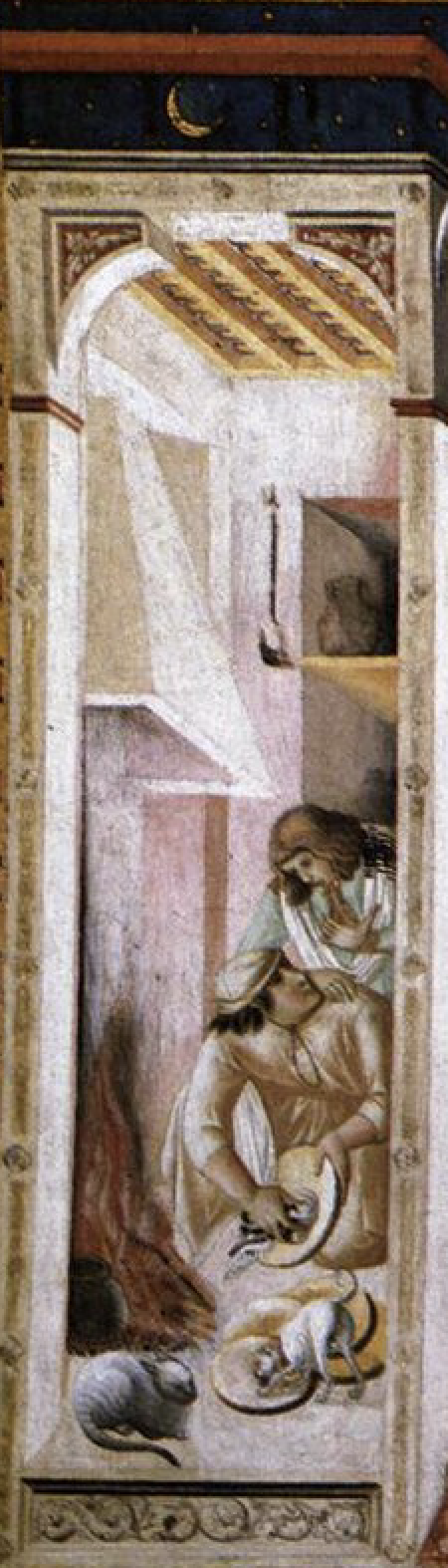 For instance, in Pietro Lorenzetti’s Last Supper (1320), a cat sits by the fire while a small dog sniffs leftovers on the floor, both signaling a warm, lived-in home rather than playing a narrative role. Similarly, the London Rothschild Hours shows a cozy household scene with a well-cared-for cat watching from the corner, again highlighting the feline presence in domestic life.